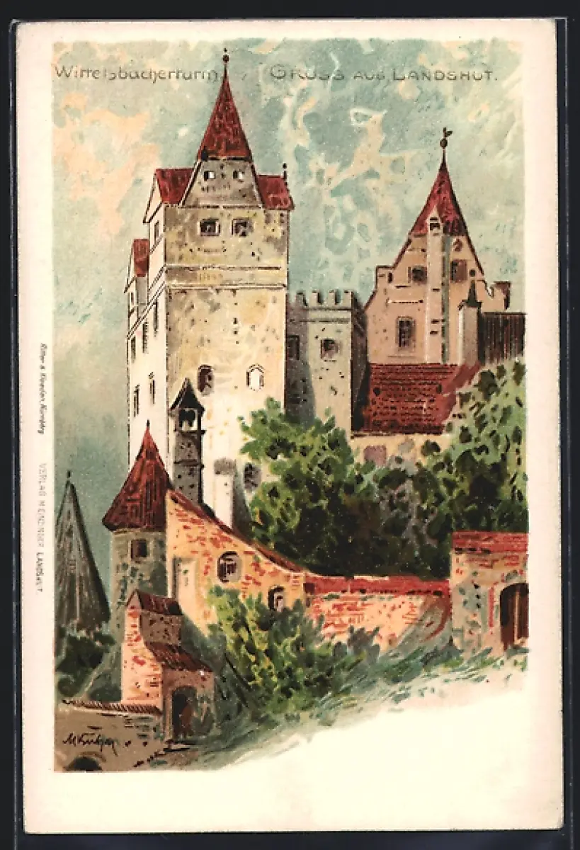 Künstler-AK Landshut / Isar, Wittelsbacherturm der Burg Trausnitz