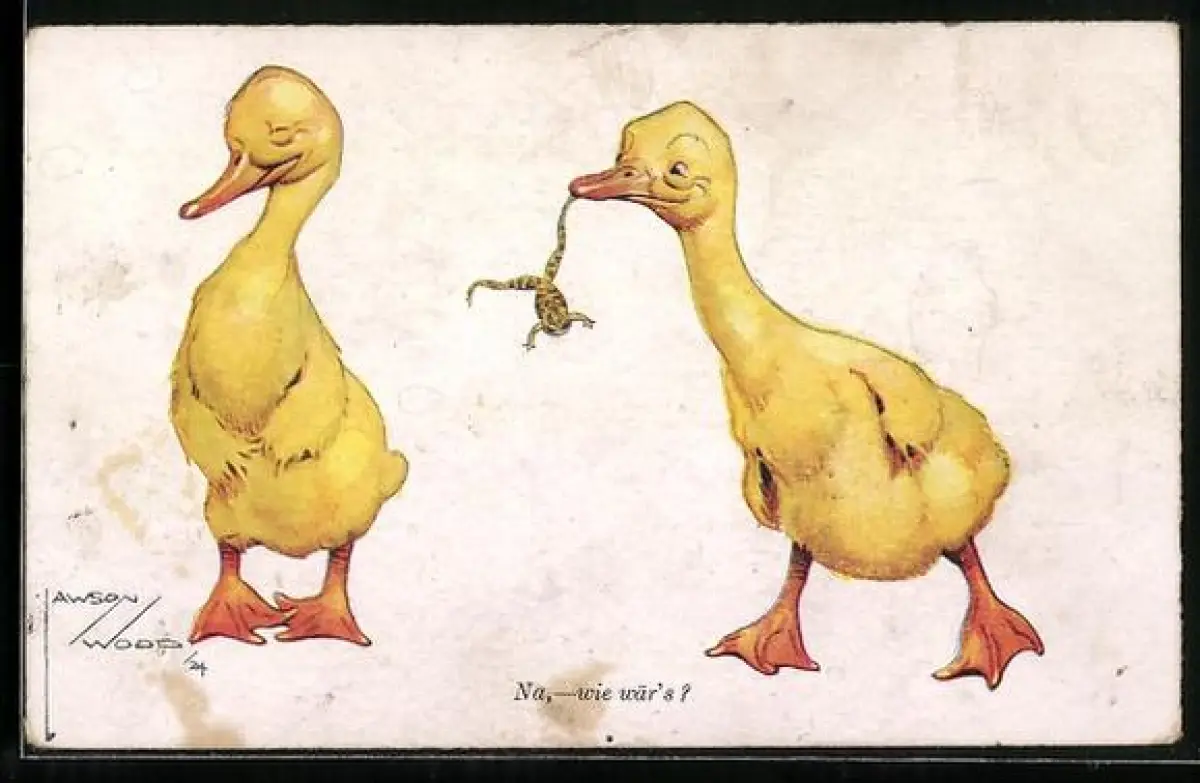 Künstler-AK Lawson Wood: Gänseküken mit Frosch als Liebesgeschenk