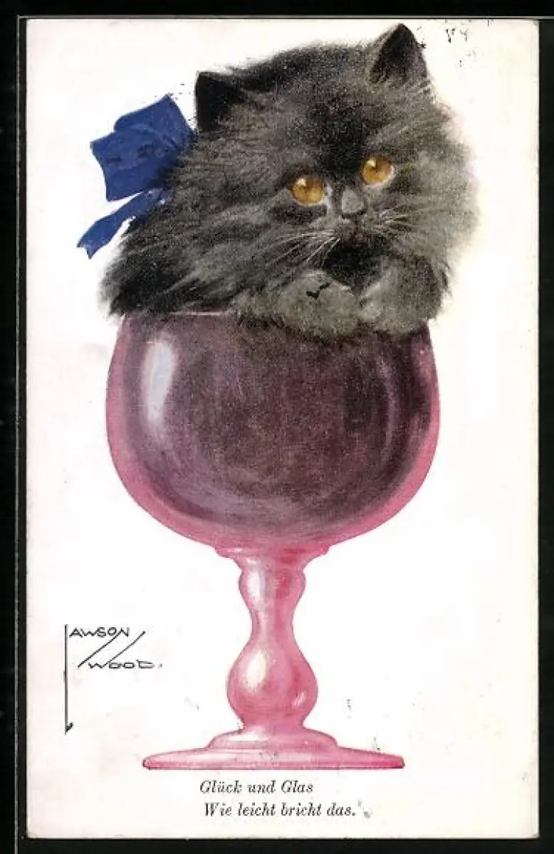 Künstler-AK Lawson Wood: Glück und Glas, Wie leicht bricht das, ein Kätzchen sitzt in einem Weinglas