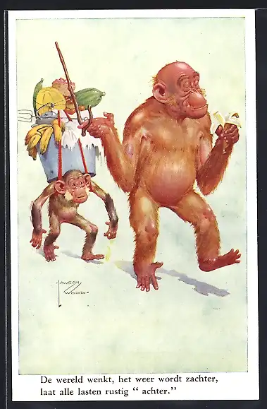 Künstler-AK Lawson Wood: Grosser Affe lässt den kleinen Kollegen das schwere Gepäck tragen