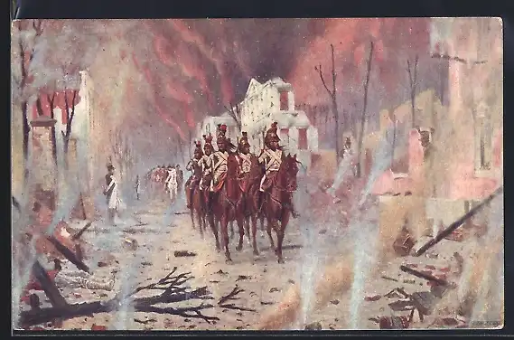Künstler-AK Le retour du Palais Pierre, franz. Kavalleristen in einer zerstörten Stadt, Befreiungskriege