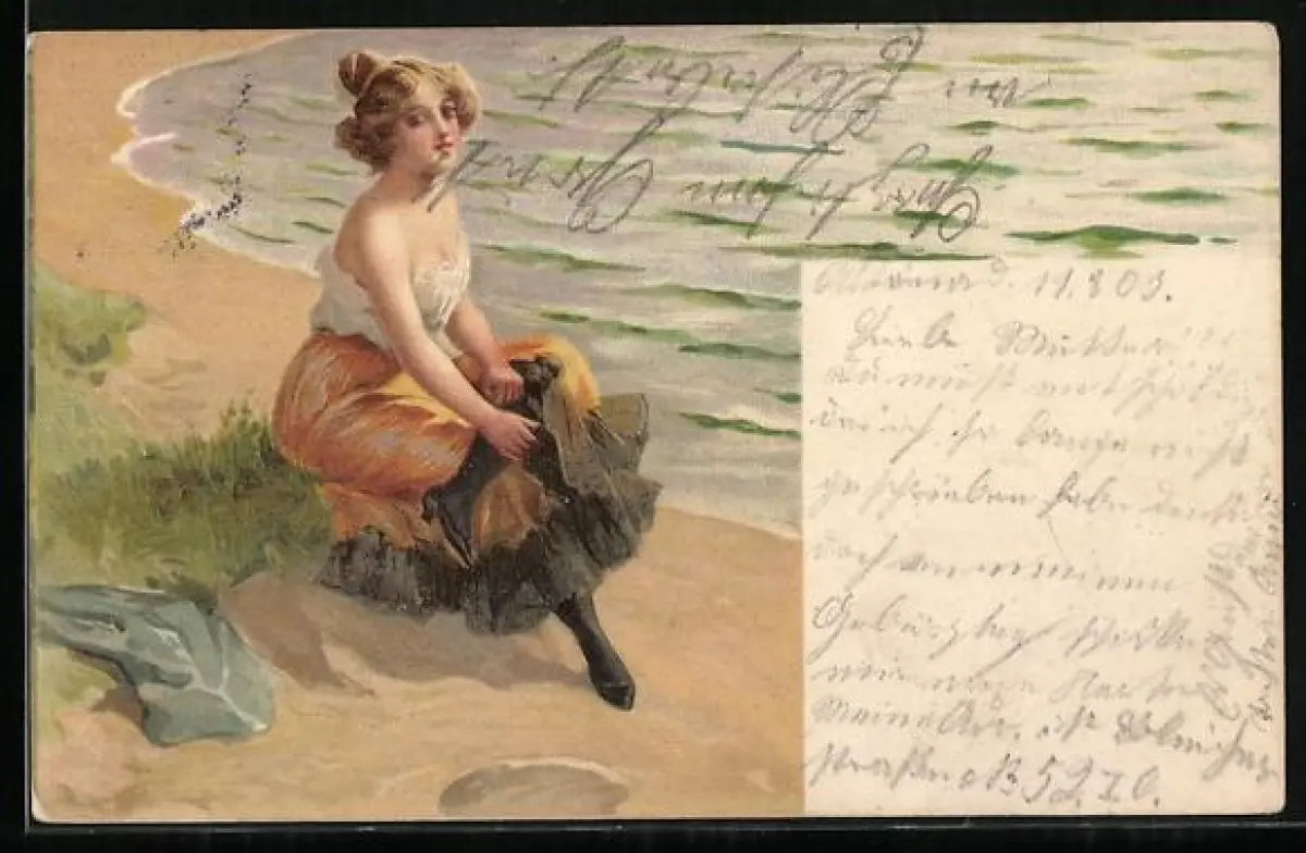 Künstler-AK Leicht bekleidete junge Frau am Strand