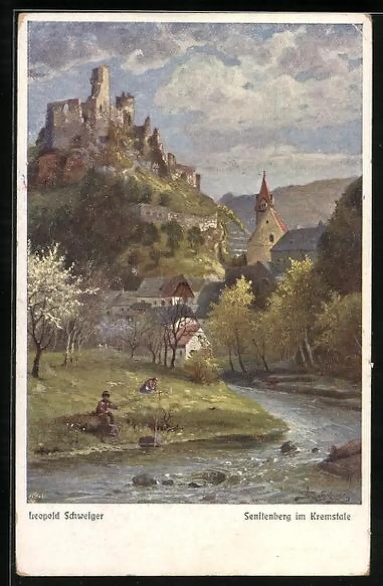 Künstler-AK Leopold Schweiger: Senftenberg im Kremstale, Ortspartie mit Angler