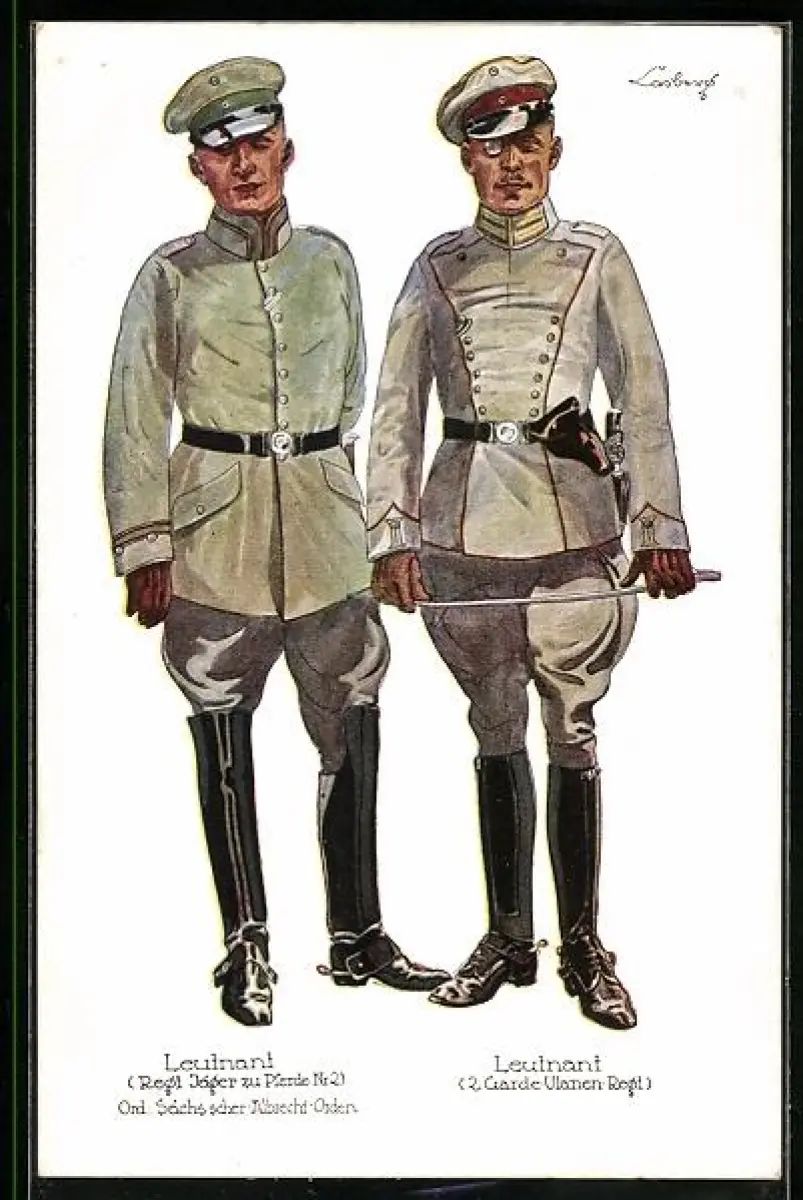 Künstler-AK Leutnant Regt. Jäger zu Pferde Nr. 2 & Leutnant 2. Garde-Ulanen-Regt. in Uniformen