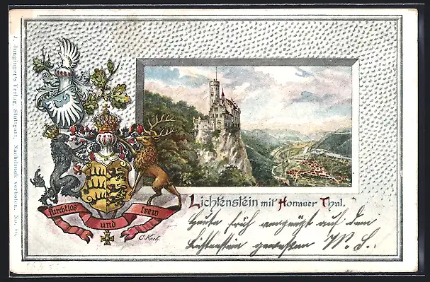 Künstler-AK Lichtenstein / Echaztal, Ortsansicht mit Honauer Thal im Schmuckrahmen