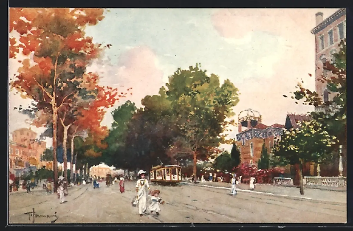 Künstler-AK Lido /Venezia, Gran Viale S. Maria Elisabetta, Strassenbahn