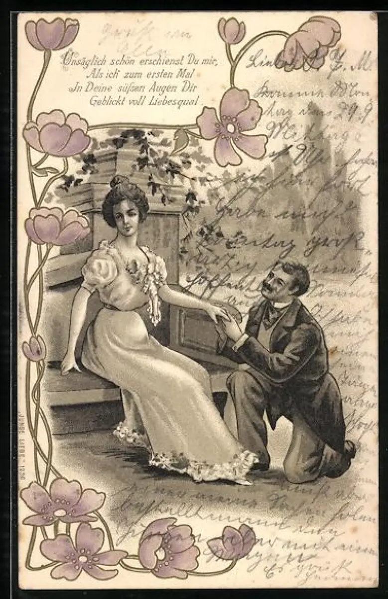 Künstler-AK Liebespaar, Mann macht der Geliebten einen Antrag