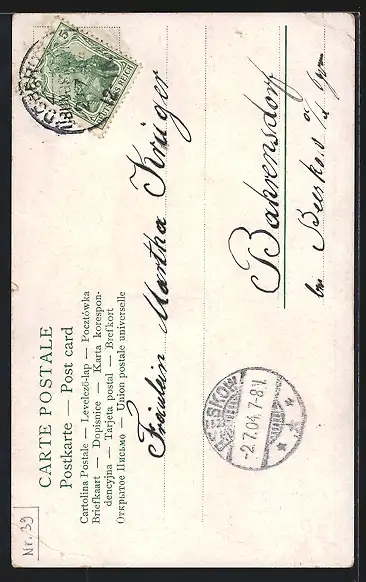 gelaufen 1904, Eckknicke li. oben u. re. unten, guter Zustand
