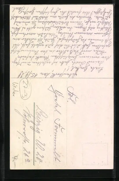 Personenbezogene Daten auf der Rückseite der Karte wurden durch blauen Textmarker unkenntlich gemacht. Die blauen Stellen sind auf die Vorderseite durchgeweicht und wirken sich negativ auf das Postkartenfoto aus