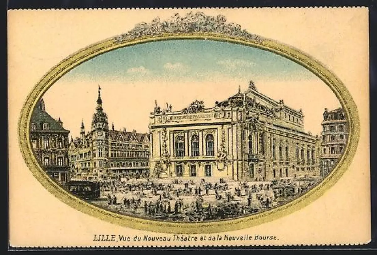 Künstler-AK Lille, vue du Nouveau Théâtre et de la Nouvelle Bourse, Strassenbahn, Passepartout