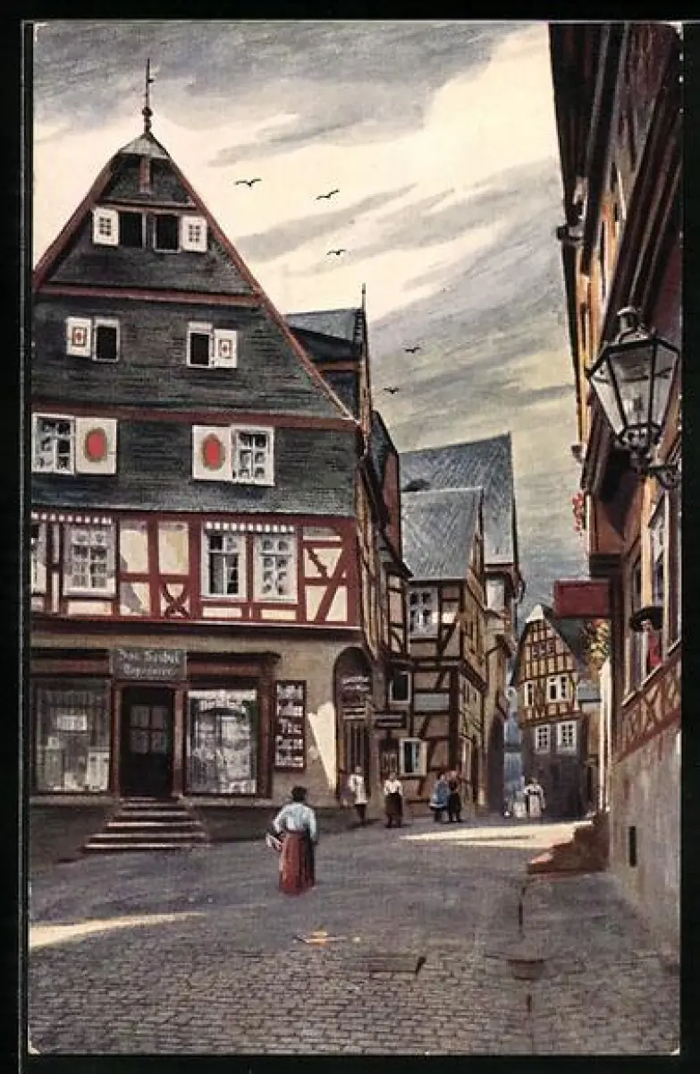 Künstler-AK Limburg / Lahn, Fachwerkhäuser am Kornmarkt