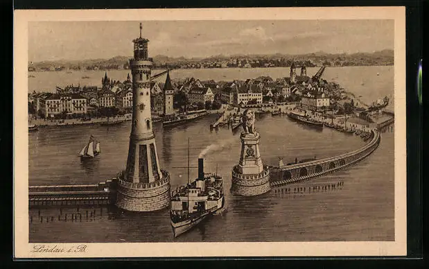Künstler-AK Lindau i. B., Der Hafen mit Leuchtturm, Dampfer