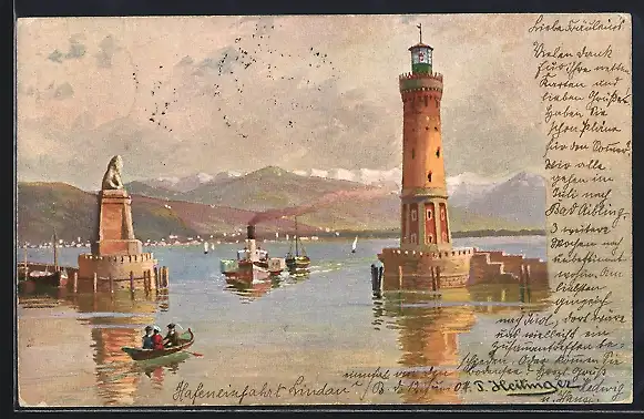 Künstler-AK Lindau i. B., Hafeneinfahrt mit Dampfer und Ruderboot