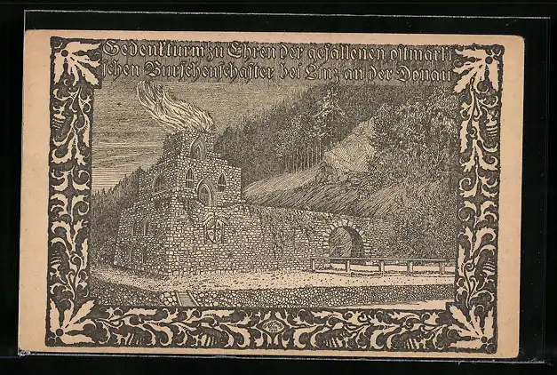 Künstler-AK Linz, Gedenkturm zu Ehren der gefallenen ostmärkischen Burschenschafter