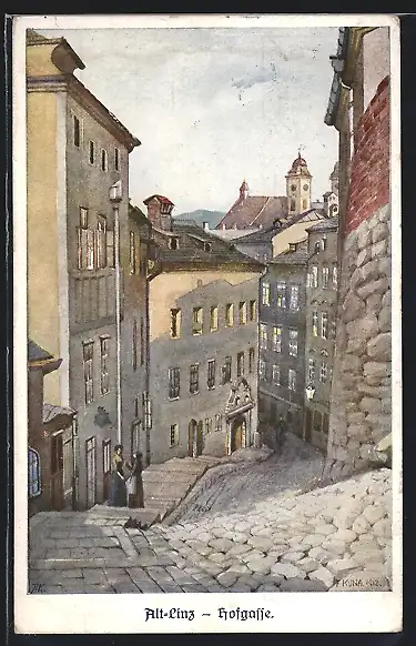 Künstler-AK Linz a. d. Donau, Strassenpartie der Hofgasse in der Altstadt