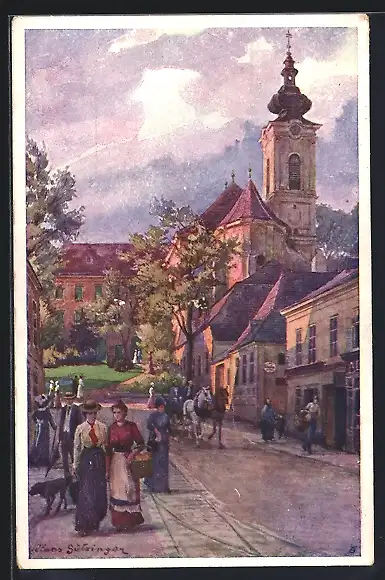 Künstler-AK Linz an der Donau, Strasse an der Kirche