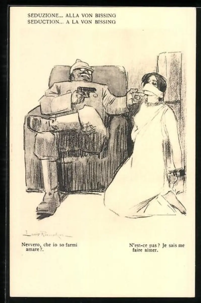 Künstler-AK Louis Raemaekers: Moritz von Bissing verführt eine gefesselte Frau mit vorgehaltener Pistole