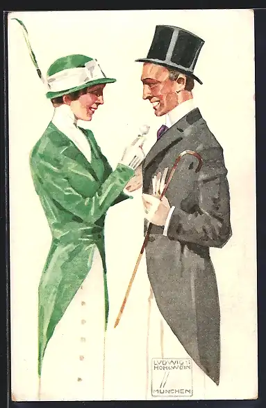 Künstler-AK Ludwig Hohlwein: Bayerischer Blumentag, Frau steckt Mann eine Blume an