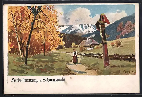 Künstler-AK Ludwig Zorn: Herbststimmung im Schwarzwald, Dame in Tracht auf dem Weg