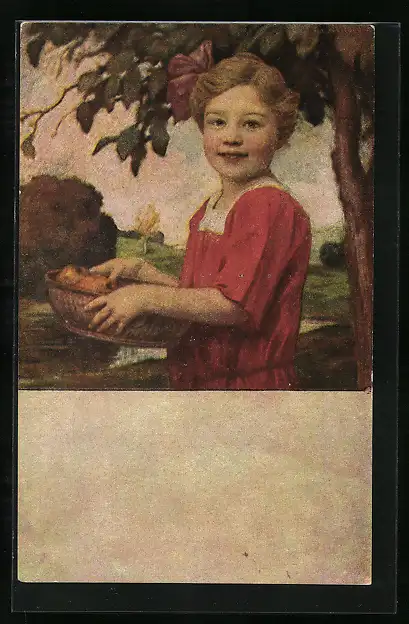 Künstler-AK Ludwig von Zumbusch: Mädchen in rotem Kleid mit Obstkorb, Herzliche Segenswünsche