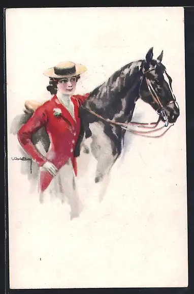 Künstler-AK Luis Usabal: Elegante Reiterin und Pferd