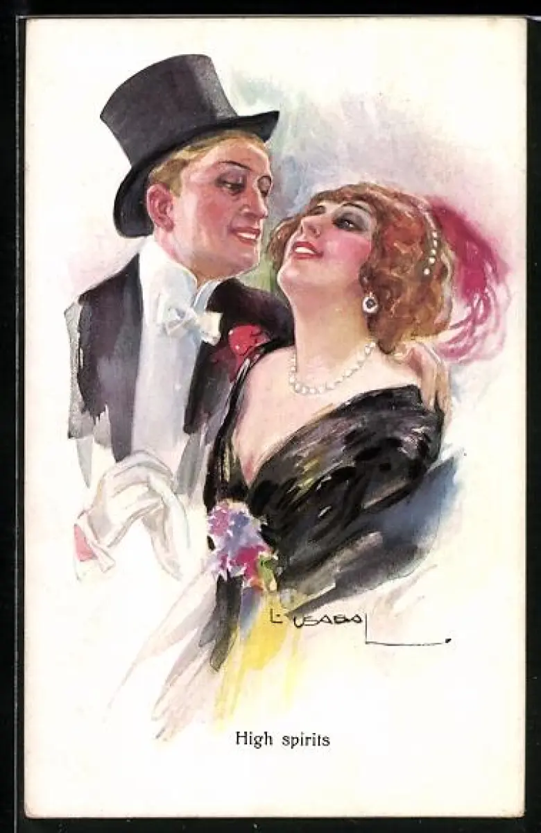 Künstler-AK Luis Usabal: High spirits, Junge Frau mit Mann im Zylinder