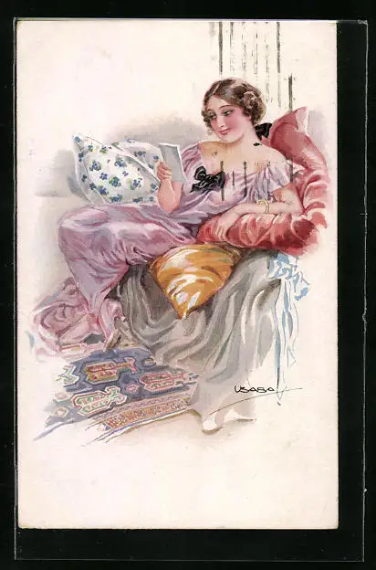 Künstler-AK Luis Usabal: Hübsche Dame liest auf ihren Kissen liegend einen Liebesbrief