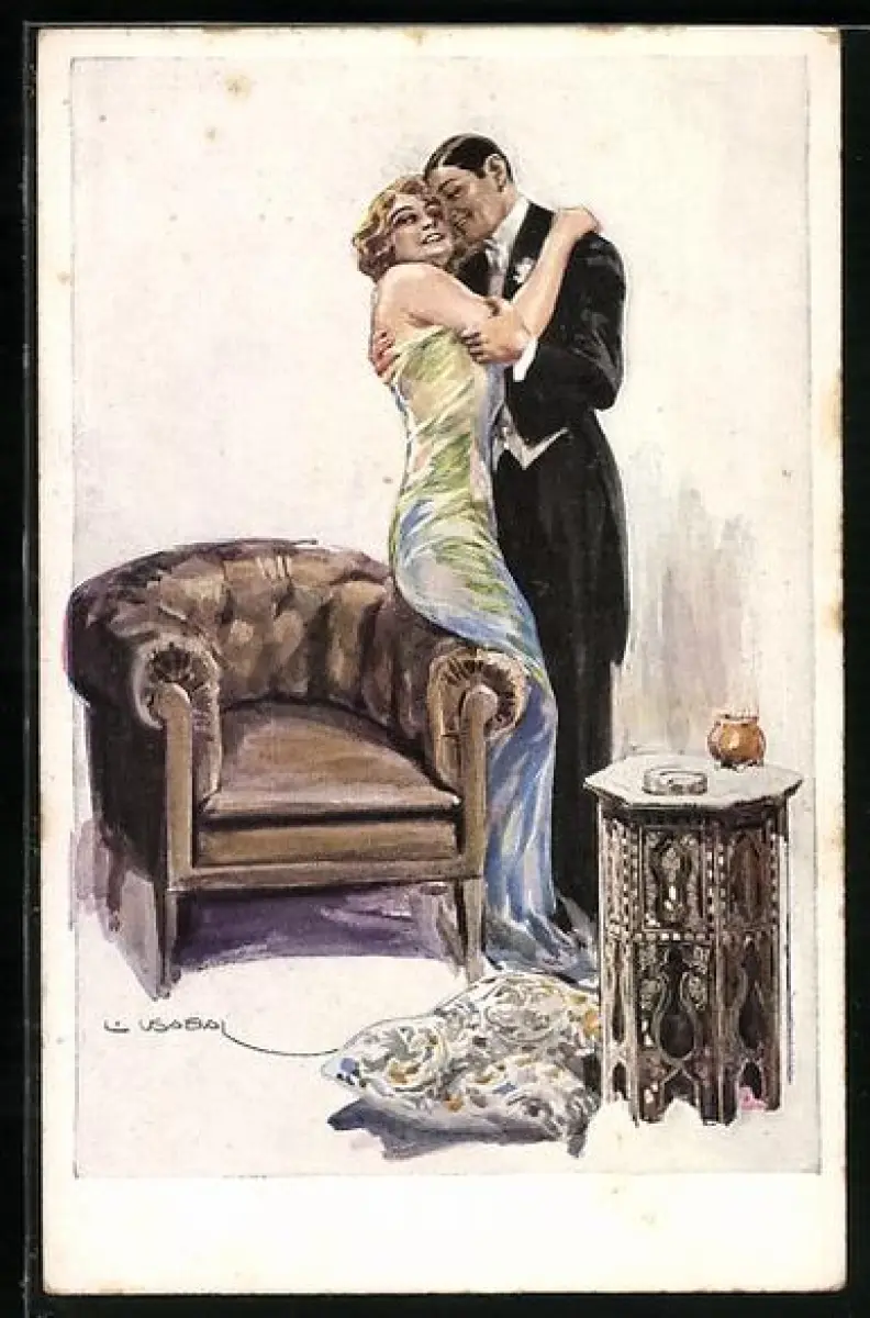 Künstler-AK Luis Usabal: Liebespaar steht innig umarmt an einem Sessel