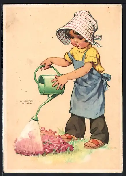 Künstler-AK Lungers Hausen: Mädchen mit blauer Schürze & Haube beim Giessen der Blumen