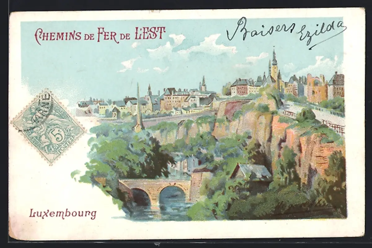 Künstler-AK Luxembourg, Vue générale, Chemis de fer de l`est