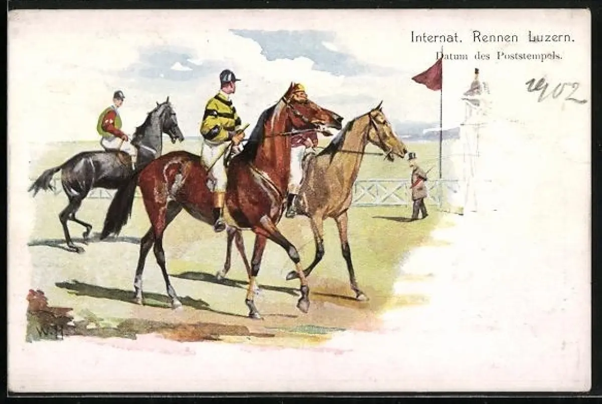 Künstler-AK Luzern, Intern. Rennen, Pferde auf der Rennbahn
