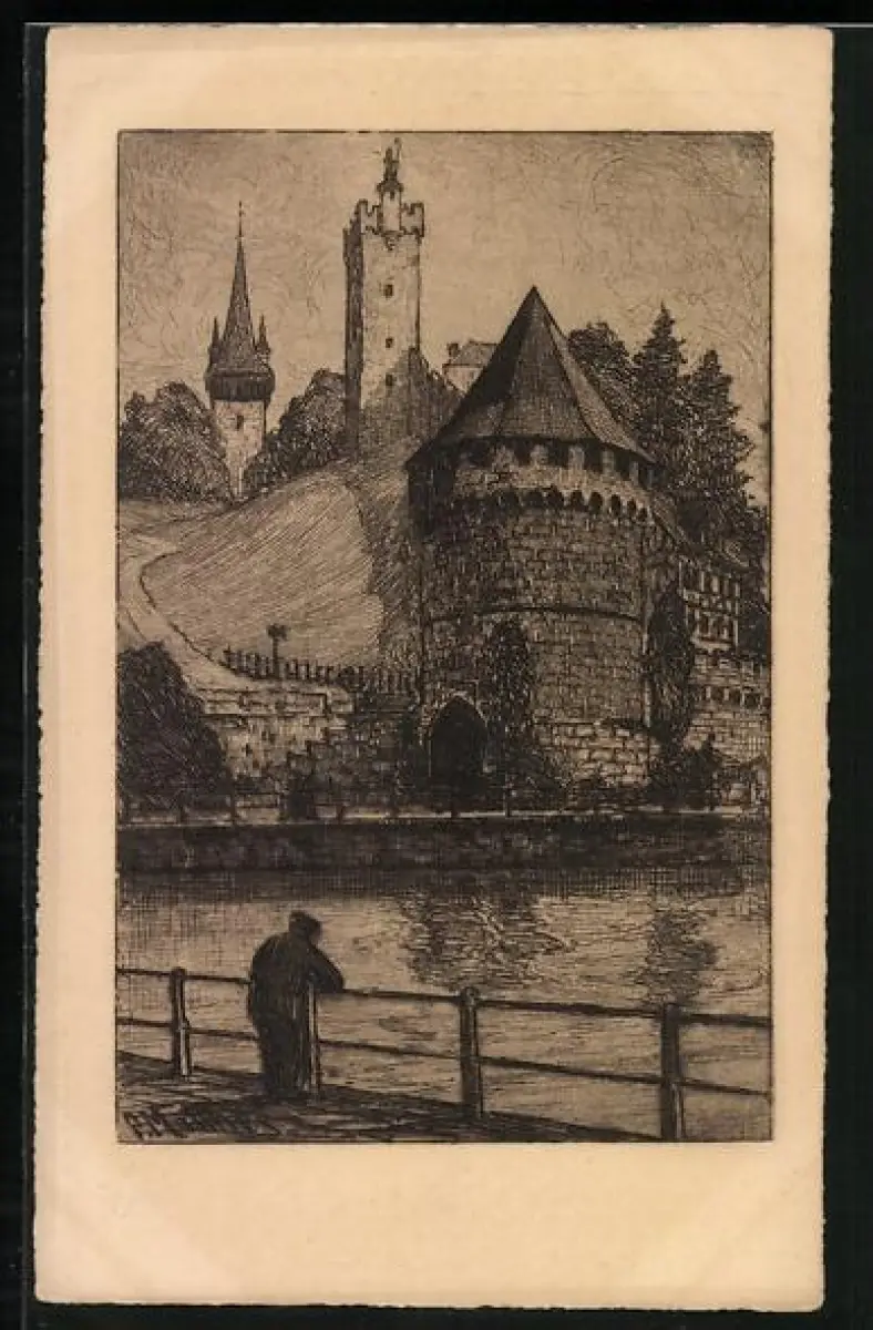 Künstler-AK Luzern, Nölliturm, Mann am Flussufer