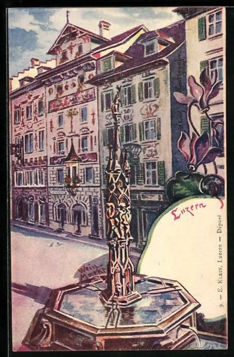 Künstler-AK Luzern, Ortspartie beim Denkmal