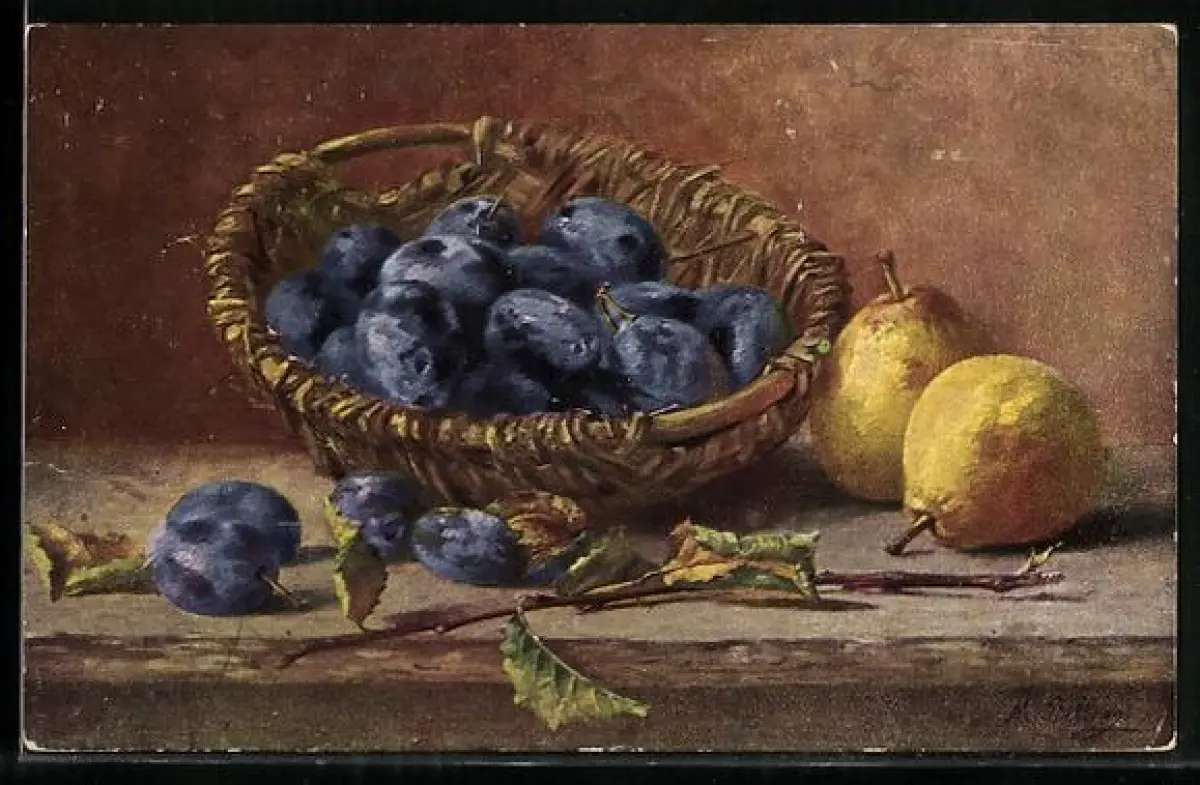 Künstler-AK M. Billing: Korb mit Pflaumen neben Birnen