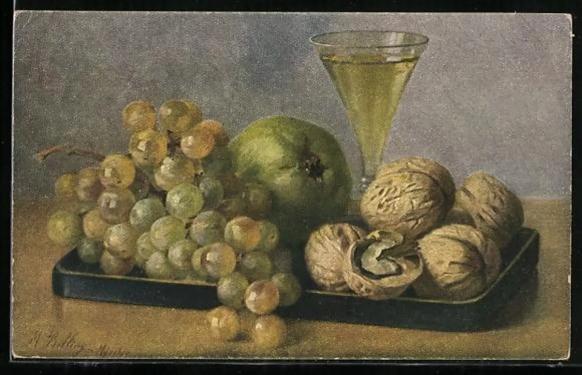 Künstler-AK M. Billing: Stilleben mit Weintrauben und Wallnüssen