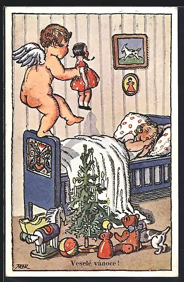 Künstler-AK M. Fischerova-Kvechova (MFK): Engel mit einer Puppe steht auf den Fussende eines Bettes