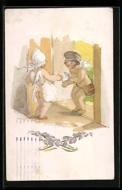 Künstler-AK M. Fischerova-Kvechova (MFK): Kleiner Engel bringt Post an die Haustür