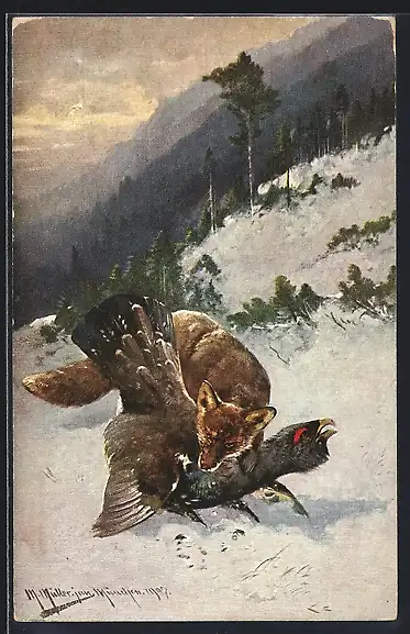Künstler-AK M. Müller jun.: Fuchs reisst Auerhahn im Winter