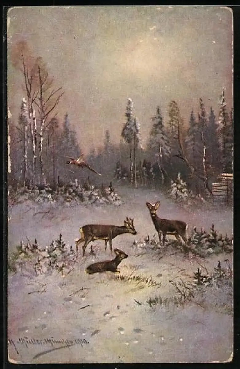 Künstler-AK M. Müller jun.: Rehe und Fasan im Winter