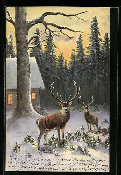 Künstler-AK M. Müller jun.: zwei Hirsche bei Abenddämmerung am verschneiten Waldrand