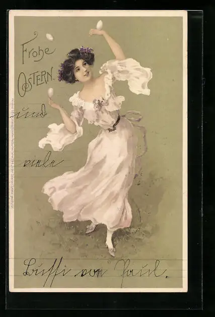 Künstler-AK M. S. M.: tanzendes Fräulein balanciert Ostereier auf den Händen