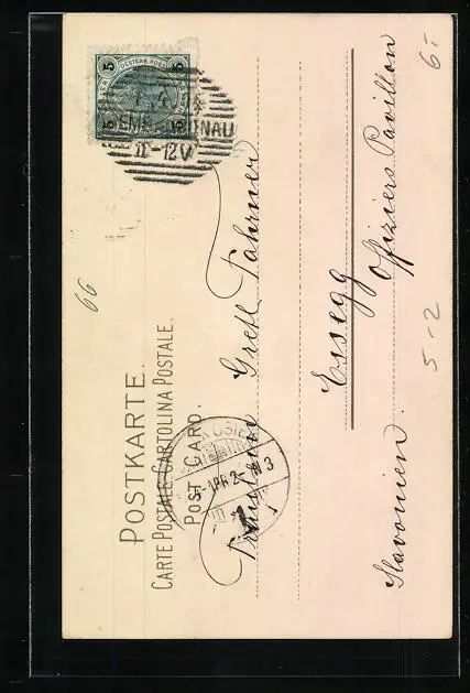 Personenbezogene Daten auf der Rückseite der Karte wurden durch blauen Textmarker unkenntlich gemacht. Die blauen Stellen sind auf die Vorderseite durchgeweicht und wirken sich negativ auf das Postkartenfoto aus