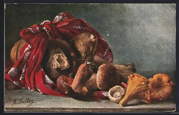 Künstler-AK M.Billing: Stillleben mit in ein Tuch gehüllten Pilzen, Steinpilze u. Pfifferlinge