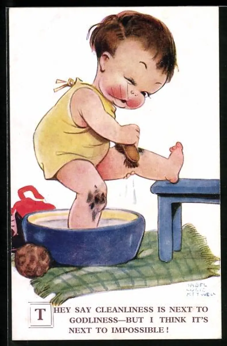 Künstler-AK M.L. Attwell: Bursche badet sich mit einer Bürste in der Wanne