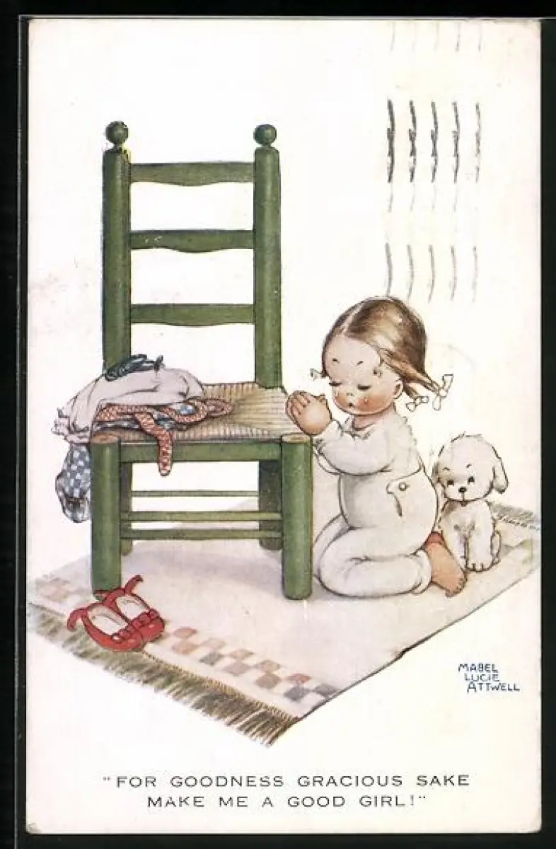 Künstler-AK M.L. Attwell: For Goodness Gracious sake make me a good Girl!, weinendes Mädchen im Gebet