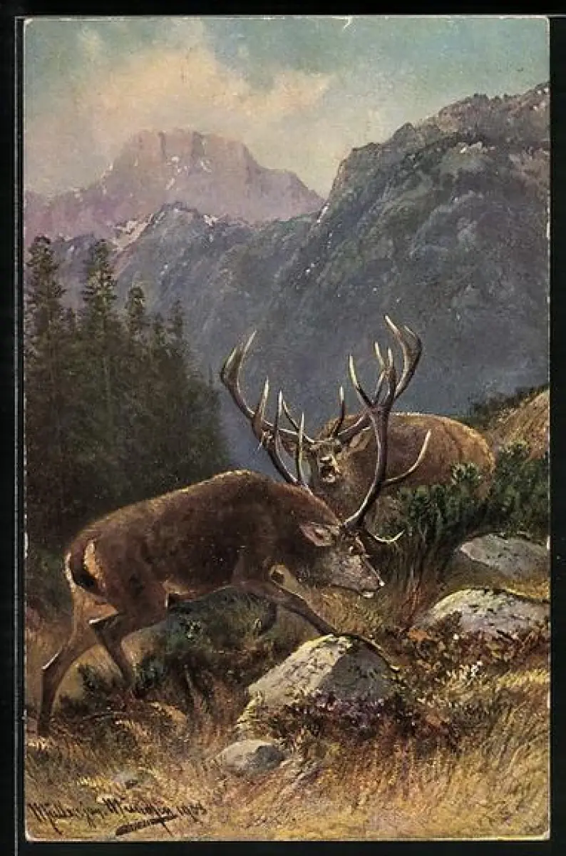 Künstler-AK M.Müller jun.: Kampf zweier Hirsche
