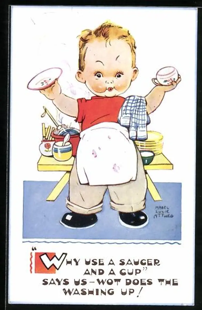 Künstler-AK Mabel Lucie Attwell: Fleissiger Junge macht den Abwasch