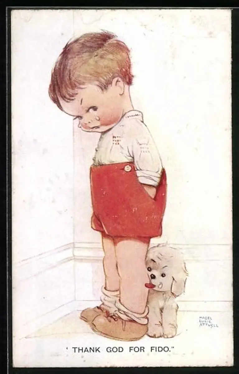 Künstler-AK Mabel Lucie Attwell: Hund leckt das Bein eines weinenden Jungen, Thank god for Fido