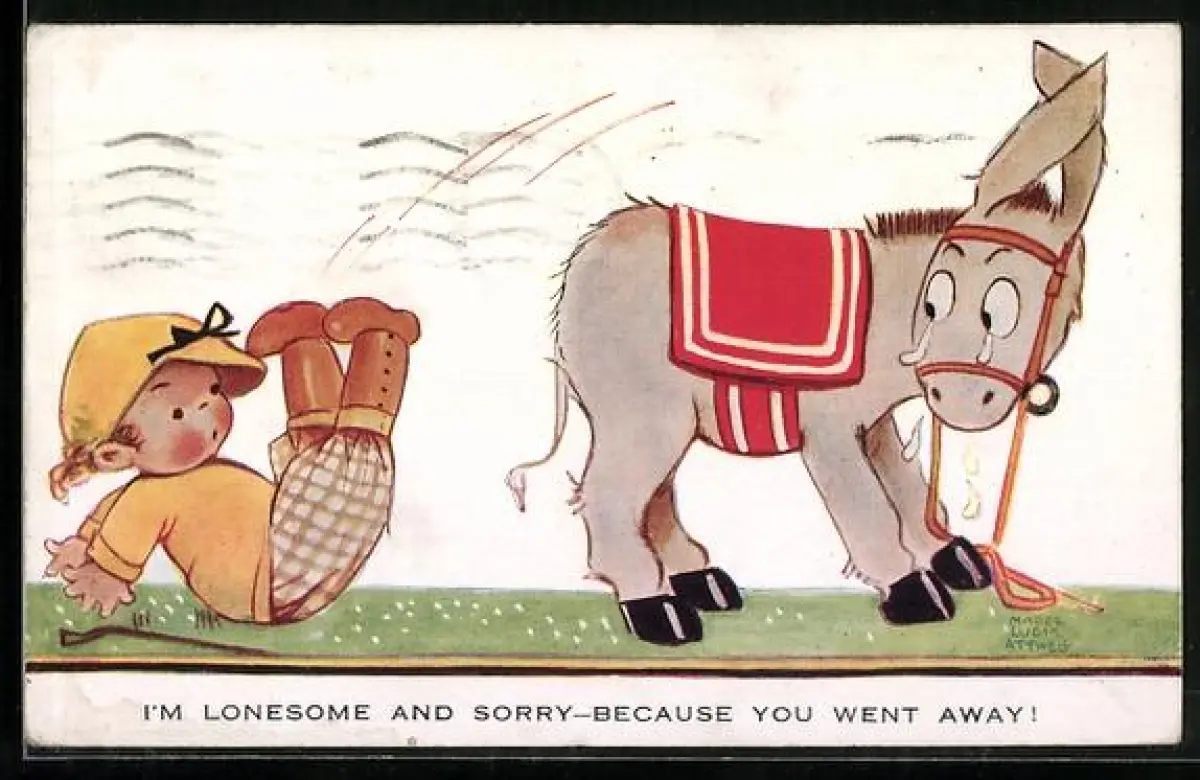Künstler-AK Mabel Lucie Attwell: Kind fällt vom Rücken eines Esels