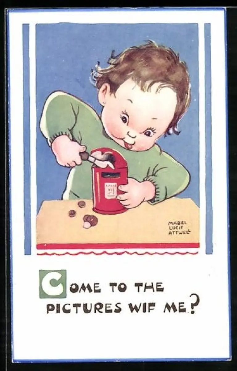 Künstler-AK Mabel Lucie Attwell: Kind mit Dosenöffner, Come to the Pictures wif me?